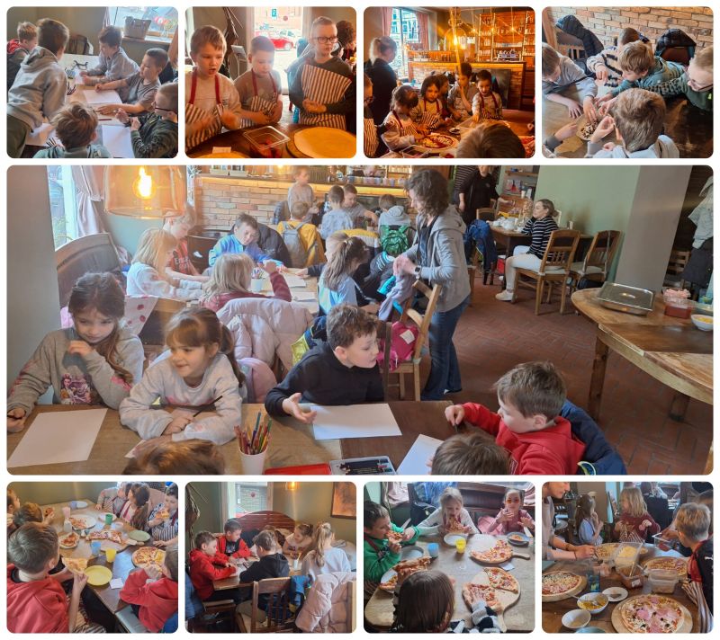 Uczniowie klas 1b, 1d i 1e wzięli udział w wyjątkowych warsztatach kulinarnych w pizzerii „Pod Drewnianym Bocianem" w Chorzowie 😊. Dzieci miały okazję poznać tajniki przygotowywania pizzy oraz samodzielnie stworzyć swoje własne, pyszne kompozycje 🍕👩🍳👨🍳. Podczas spotkania odbył się także konkurs plastyczny 🎨, w którym zwyciężyli Iga i Tymek z klasy 1b 👏🥇. Nie zabrakło oczywiście degustacji – pizza była przepyszna 😋, a na zakończenie wszyscy uczestnicy zostali poczęstowani słodkimi, pysznymi ciasteczkami 🍪❤️.