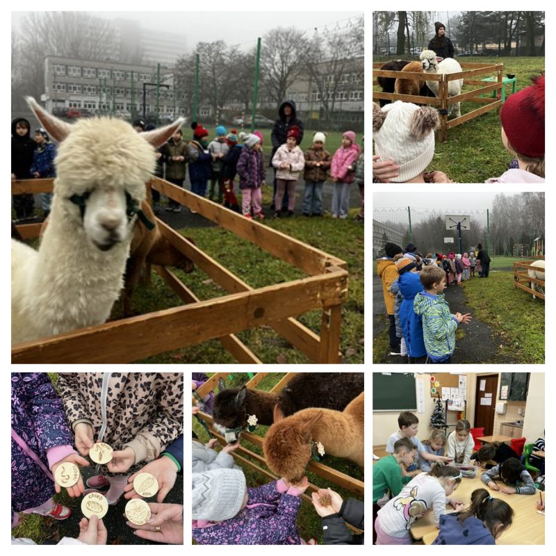 11 i 12 grudnia naszą szkołę odwiedziły zwierzaki - cudaki, czyli alpaki 😊. Uczniowie klas 1 i 2 mieli okazję poznać zwyczaje żywieniowe tych zwierząt, nakarmić je specjalną karmą i pogłaskać. Po spotkaniu z alpakami uczniowie w salach wykonali świąteczną ozdobę choinkową. Wszyscy świetnie się bawili!